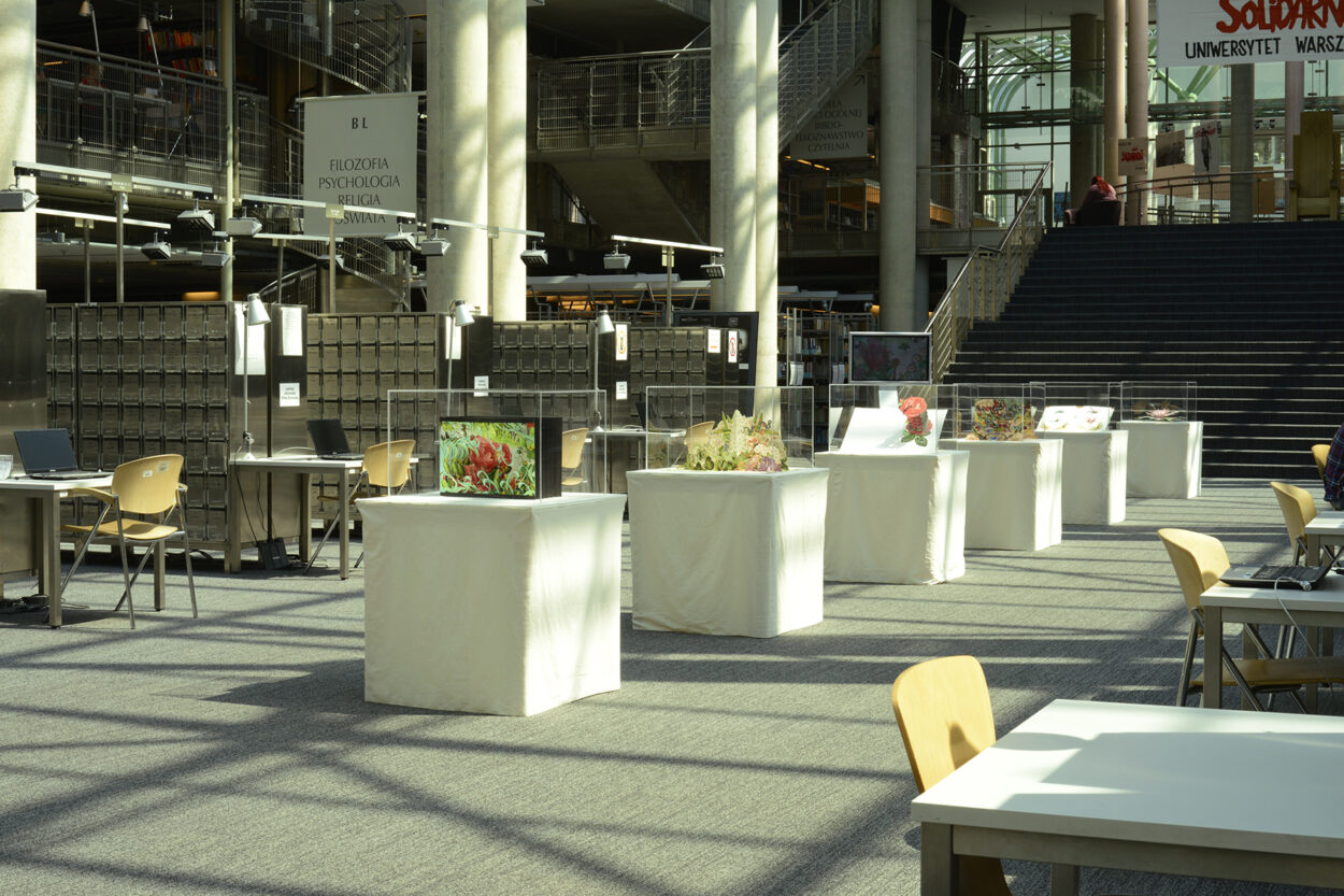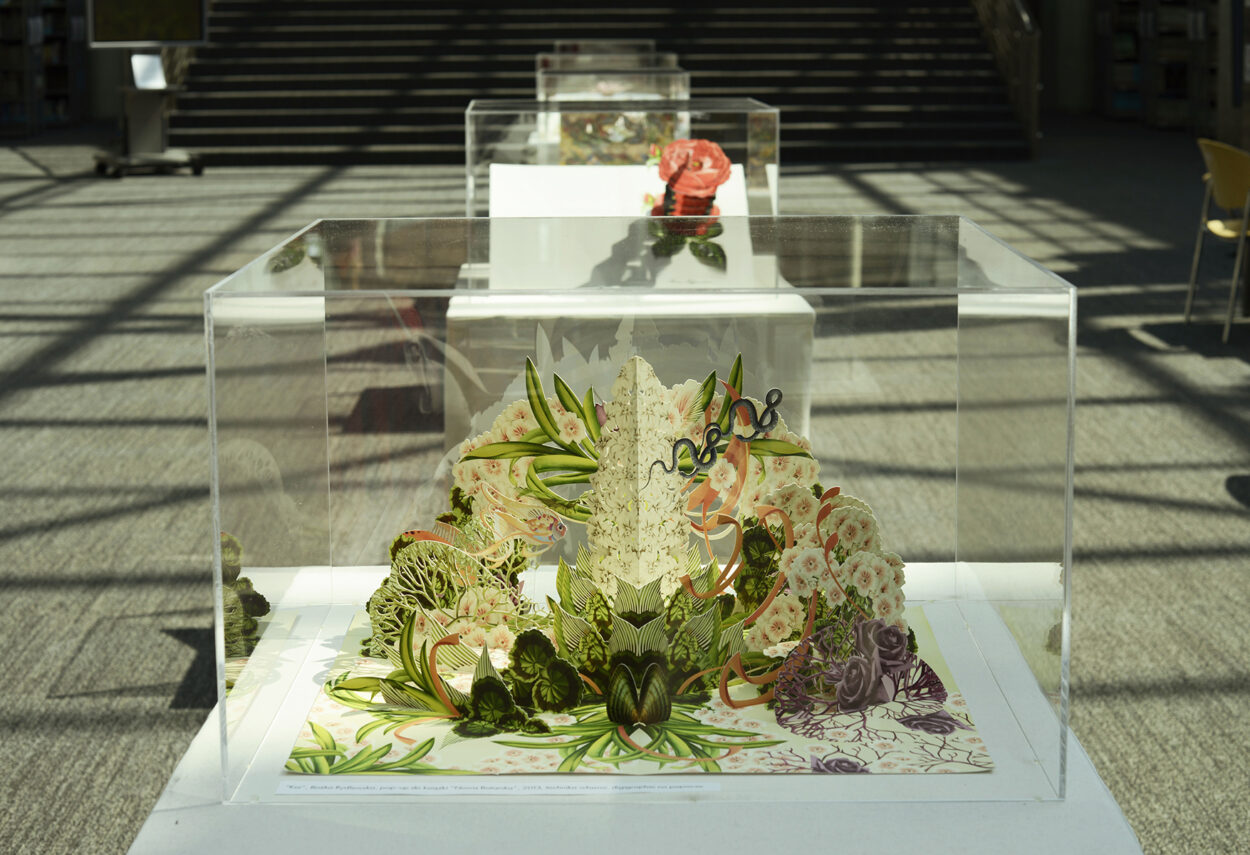 W ramach Światowego Dnia Książki moja artystyczna książka pt. „Nowa Botanika” została zaprezentowana w gmachu Biblioteki Uniwersytetu Warszawskiego. Wyeksponowanie trójwymiarowych stron książki pomiędzy regałami biblioteki tworzyło dla niej nowy, ciekawy kontekst.